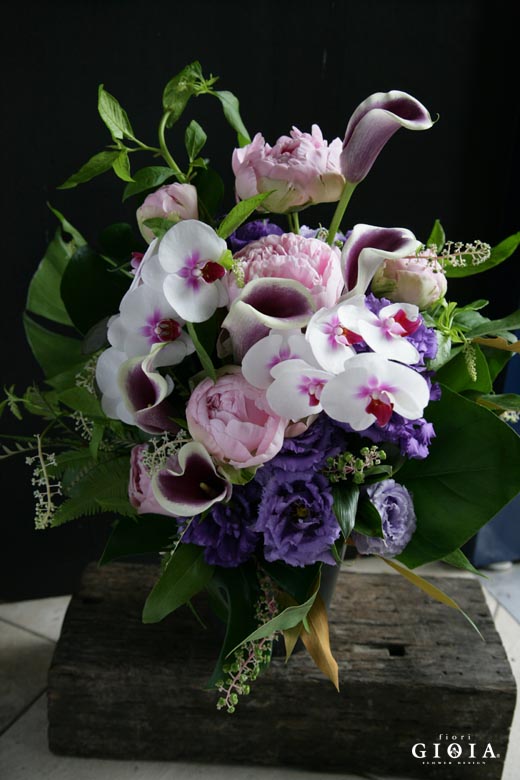 ・芍薬(薄ピンク)・ミディ胡蝶蘭(赤リップ)・カラー・トルコキキョウ(パープル)・ヤマゴボウ(つぶつぶ)・モンステラ