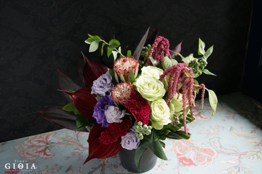 ・プロテア・バラ(ホワイト)・トルコキキョウ(パープル)・ブルーベリー(実物)・ケイトウ(レッド)・アマランサス・アンスリューム(赤葉)
