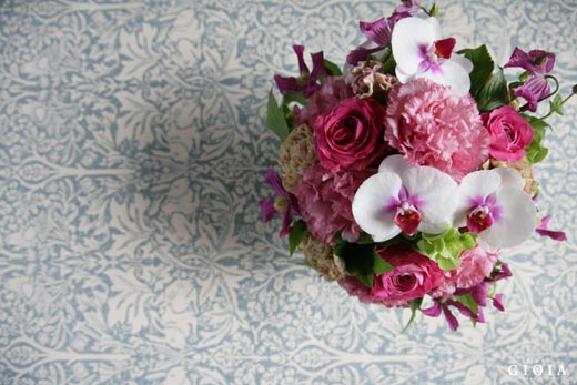 ピンク系で可愛く、まん丸なデザインのアレンジメント。ミディーの胡蝶蘭がポイントです✨