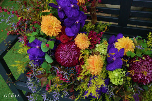 秋カラーで華やかに☆彡・ダリア(オレンジ)・菊(大輪赤)・バンダ(パープル)・ケイトウ・ミニグリーンあじさい・ユーカリ・マム・シンフォリカルポス(赤の実もの)・ティナス(実もの)・ブルーファン(パープル小花)・クレマチス
