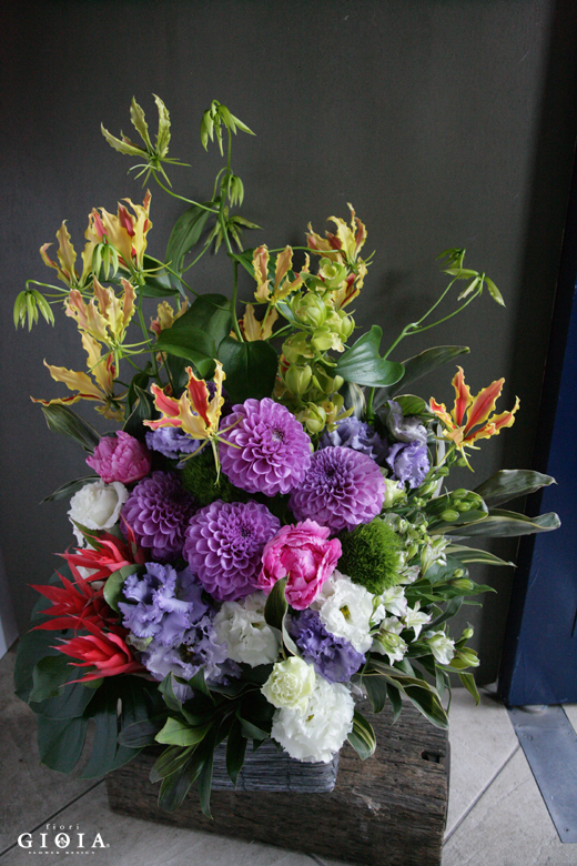 ・ダリア(パープル)・グロリオサ(赤黄)・トルコキキョウ(パープル・白)・シンビジューム(緑)・グズマニア(赤)・テマリソウ・アルストロメリア
