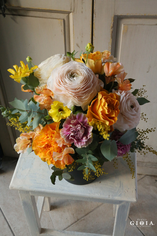 ・ラナンキュラス(白)・バラ(オレンジ)・カーネーション(ピンク)・スイートピー・ミモザ・ラナンキュラス(ラックス(黄))