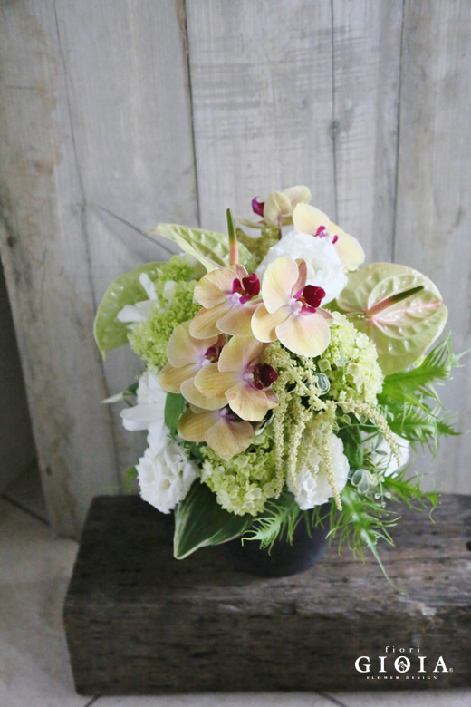 ・ミディ胡蝶蘭・アンスリューム・ヒモケイトウ・クルクマ・トルコキキョウ